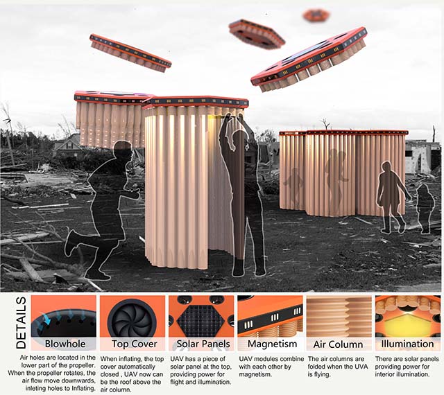 当无人机飞抵灾区后,无人机利用自身旋桨产生的风力,对其内部搭载的压缩气柱进行充气后,可形成墙体立面。每七个模块,可以组合成一个家庭单元,将部分气柱收起时可以实现空间的贯通。模块化的设计具有更多的自主性,受灾群众可以根据自身情况组合成任意大小的帐篷,以满足不同人数的家庭需求。