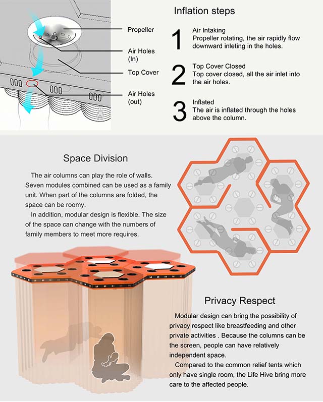 “LIFE HIVE”(蜂巢救灾无人机系统)模块化的设计使得帐篷在搭建的过程当中,可以实现不同的需求,使得救灾过程更加的合理卫生。例如三个模块即可组成临时的公厕,七个模块即可组成家庭居住单元,更多的模块则可以搭建成医疗救护中心等等。