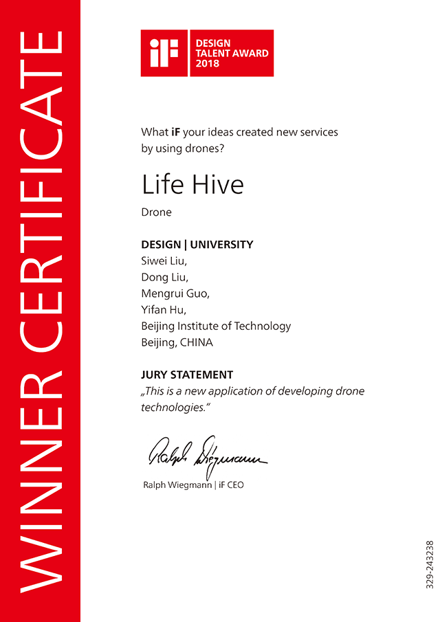 iF新秀设计大奖(IF TALENT AWARD)的评选聚焦于当前最重要的社会议题,收集有可能改变世界的创新想法,致力于寻找引领未来产品设计方向。 北理工设计学院郭萌睿、刘思维、刘冬、胡一帆四名同学的设计作品“LIFE HIVE”(蜂巢救灾无人机系统)参与了四个类型分组中的“新无人机服务”项目角逐,该项目要求探索发现无人机的新服务项目。作品要在“创新与精致”“美感”“责任”“功能”和“定位”五个方面都具有杰出的表现,才能获得该奖项。