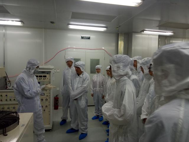 最后同学们参观了芯片加工的超净间及微电子相关重点实验室,电子所老师向大家介绍并展示了芯片加工过程中的主要步骤,并着重强调了在硅片上进行的镀金和刻画等操作,同时也结合我国微电子技术发展形式激励同学们努力学习,为我国微电子事业贡献自己的一份力量。