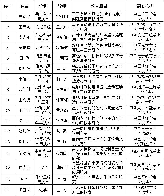北理工2018年已获17篇全国学会优秀学位论文