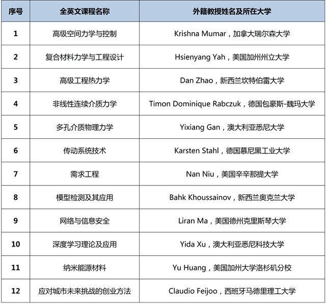 校内暑期学校由研究生院主办,宇航学院、机电学院、机车学院、计算机学院、材料学院和国际交流合作处协办,2019年共接收研究生253名(包括留学研究生)参加,邀请外籍学者12位,开设了12门全英文课程,每门课32学时,课程名称、专家姓名和所在大学如下: