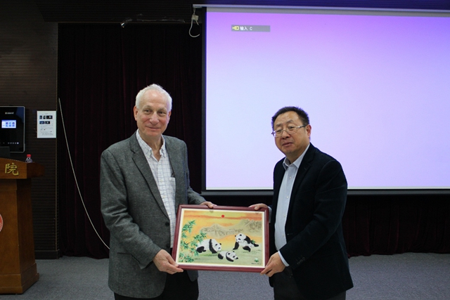 报告结束后,方岱宁院士为Needleman教授颁发了北理工“百家大讲堂”的授课证书,同时送上了象征着友好、和平和团结的熊猫刺绣,表达了对Needleman教授的感谢以及和Needleman教授合作的期望。