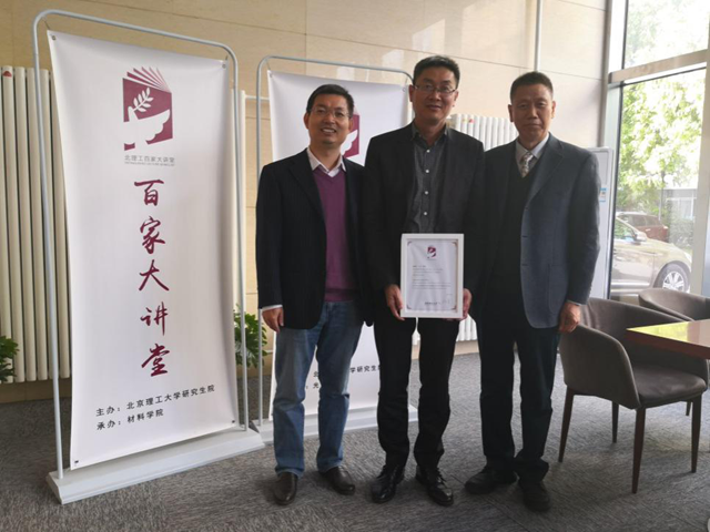 德赢AC米兰官网化学与化工学院院长张加涛教授和国家阻燃材料工程技术研究中心主任杨荣杰教授,向王浩教授赠送了北理工“百家大讲堂”证书。