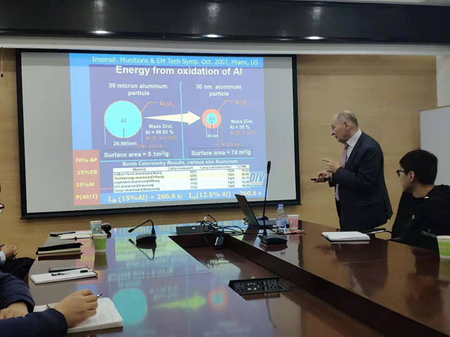Vladimir E.Zarko教授在报告中介绍了纳米含能材料和聚氮化合物的发展历史,分析了各个国家的研究者对纳米含能材料和聚氮化合物发展所作出的贡献,探讨了含能材料未来的发展方向。Vladimir E.Zarko教授的报告图文并茂,深入浅出,给在场师生带来了一场顶级的学术盛宴。报告结束后,Vladi mir E.Zarko教授与在座的师生们就含能材料的发展问题进行了热烈讨论。