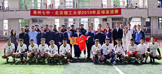 在足球场,王兆华向庄月芳赠送了北理工足球队队旗和球员签名球衣,北理工足球队与泉州七中足球队小将进行了一场“以球会友”的交流活动。北理工足球队的大哥哥们还为七中的小球员送上签名足球,球场上欢声笑语一片。北理工在校学生家长代表,已签约北理自主招生的七中学生参加了此次活动。