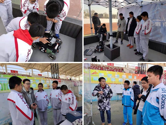 在本次展演中,自动化学院机器人队准备了两台AI机器人和一台Robomaster步兵机器人参与展示。在精心搭建的场地上,AI机器人向同学们展示了AI自主检测、跟踪、躲避、对抗射击等一系列行动,吸引了许多中学生驻足观看比赛。比赛结束后,同学们向队员们提出了关于比赛规则,裁判系统,机器人开发等各种问题,机器人队队员则耐心地对这些问题一一进行了解答,并向他们赠送北理工定制的书签和笔袋。同时,为让一零一中学的学生更加近距离地感受科技创新的乐趣,队员们还让大家亲手体验了Robomaster步兵机器人的操作,现场气氛十分热烈。