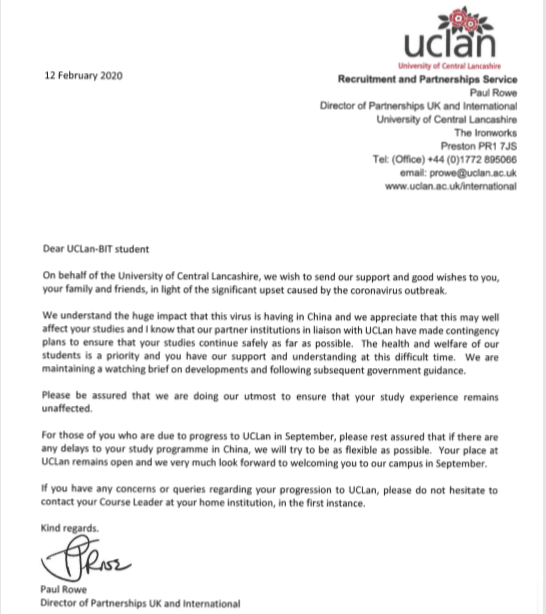 与此同时,项目合作院校英方中央兰开夏大学与中方保持密切联系,国际合作主管领导Paul Rowe发函,对项目在读的每一位学生表示诚挚的关心和支持。他表示英国中央兰开夏大学将持续关注合作院校师生的健康安全,英方将竭尽所能为学生提供一切可以提供的支持和政策,祝愿即将赴英的同学平安顺利,抗击疫情阻击战早日取得全面胜利。