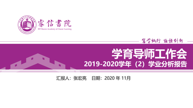会上,张宏亮首先介绍了书院2018级和2019级学生在2019-2020学年第2学期的学业分析报告,对比了同年级上下两个学期的学习情况以及与高年级同期的学业情况。接着,他从学育导师工作规范、重点工作和具体要求三个方面,对学育导师工作进行了说明。他要求学育导师要对照工作规范,一是履行岗位职责,完成工作任务;二是加强思想引领,参加班级建设;三是夯实学风建设,做好学业帮扶;四是开展心理辅导,关注重点学生;五是注重创新培养,提供项目资源;六是加强专业教育,传承学院文化。