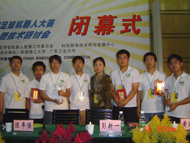 由机电工程学院和信息科学技术学院共同组成的我校新一届机器人足球代表队在刚刚闭幕的“广州理想杯”2004中国足球机器人大赛上,经过激烈争夺,最终取得了RoboCup比赛第四名和FIRA比赛第八名的好成绩!