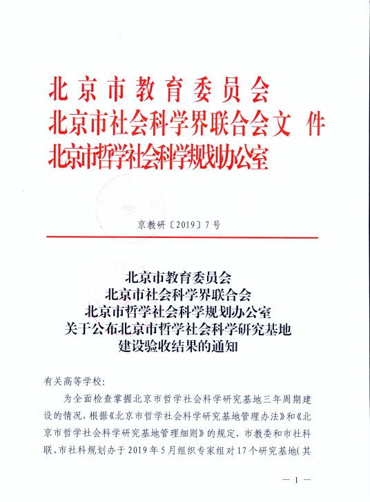 近日,北京市教育委员会、北京市社会科学界联合会、北京市哲学社会科学规划办公室联合发文,对2019年参与北京市哲学社会科学研究基地三年周期建设检查的结果予以公布。我校北京经济社会可持续发展研究基地获评“优秀研究基地”。此次三年周期建设验收,全市共有17家研究基地参加,仅有4家获评市级优秀研究基地,另有2家研究基地检查结果为不合格。