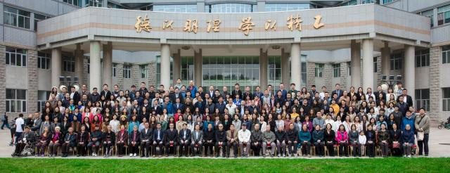与会嘉宾、校友一起在中心教学楼门前合影留念。