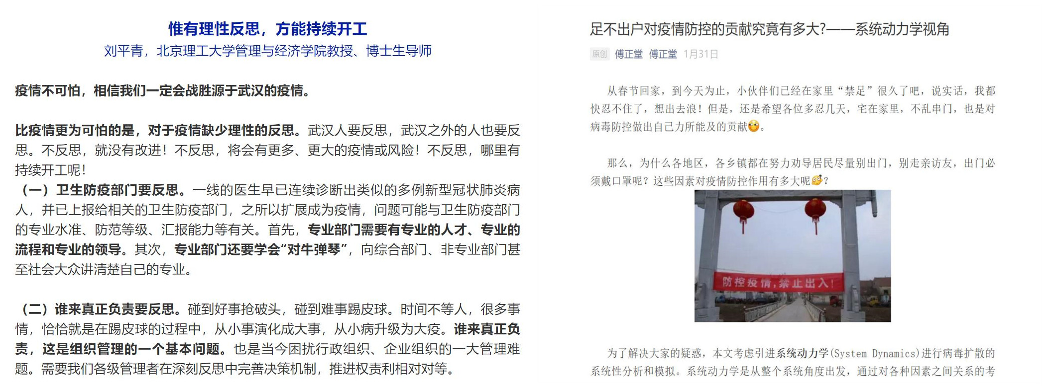 刘平青教授发布在新媒体“人力资源教授荟”的文章《惟有理性反思,方能持续开工》,从人力资源与组织行为学的角度出发,倡议社会各界从卫生防疫部门、谁来真正负责、人与自然关系、面对疫情心态、对生命的关注以及社会发展速度六个方面反思总结,实现个人、组织和社会的共同健康发展。2019级博士生傅正堂通过个人公众号发布文章《足不出户对疫情防控的贡献究竟有多大——系统动力学视角》运用管理科学领域的系统动力学方法,采用仿真建模手段,从管理学角度分析了当前的防疫措施(戴口罩、勤洗手、少出门、不聚会等)对阻止病毒在人群中传播扩散的重大作用,向社会大众科普了居家隔离对疫情防控的重要性。