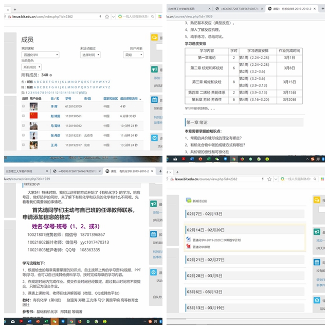 2月4日,学校发布了《关于推迟2020年春季学期开学时间的通知》,学院积极响应,根据学校疫情防控教学专项会议精神,成立以院长书记为组长、教学院长和学生工作副书记为副组长的“化学与化工学院教学质量保障组”,负责落实本学期的教学方案和教学过程的实施情况,确保疫情防控期间本科教学的顺利进行与高质量教学效果。建立了学院乐学微信群,及时讨论、学习乐学平台线上课程的准备以及解决相应的问题,并在群里发布问卷星调查表,随时掌握课程进度和问题;目前,学院除9门需要在实体实验室进行的实践类课程外,全部理论课程(共计29门)已经按照教学计划在乐学平台上建课,主讲教师应用多种信息化资源,录制带音频的PPT、使用MOOC、SPOC等网上优质教学资源,以多种教学模式结合来准备网络授课;同时,在乐学平台基础上,各课程还建立课程微信群、慕课堂等,特别加强与学生互动,督促调动学生学习主动性。《给化学与化工学院学生的一封信》在开课前推送给所有学生,提醒学生主动参与网络教学,齐心协力,完成现阶段远程教与学。