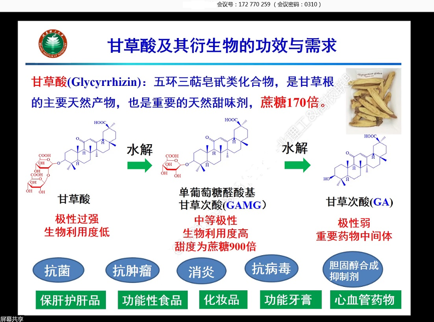 作为本次活动承办单位,德赢AC米兰官网推荐路演的两个项目备受参会人员的广泛关注。来自化学与化工学院李春教授团队的吕波特别研究员分享了“甘草酸衍生物分子模拟筛选与制备项目”的相关情况。该项目通过分子设计和理论计算,给出基于甘草酸及其衍生物的候选小分子药物,可获得防疫新型冠状病毒侵染与减少炎症风暴的甘草酸结构衍生物。课题组具有多年研究积累,目前正在与某重点医药企业合作实施中试扩大,成果具有良好的转化应用前景。