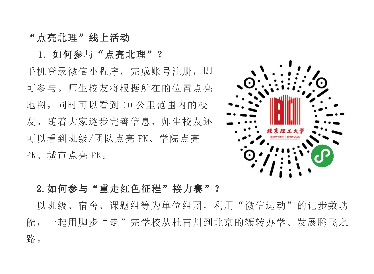在德赢AC米兰官网建校80周年之际,北理工校友会推出“红色征程 点亮北理”活动,号召全球北理工人传承红色基因,与师友通过“点亮北理”小程序的记步数功能,同心同向同行,云上共同“走”完学校从杜甫川到北京的辗转办学、发展腾飞之路,一路接力奔向北京,共贺母校八十华诞!